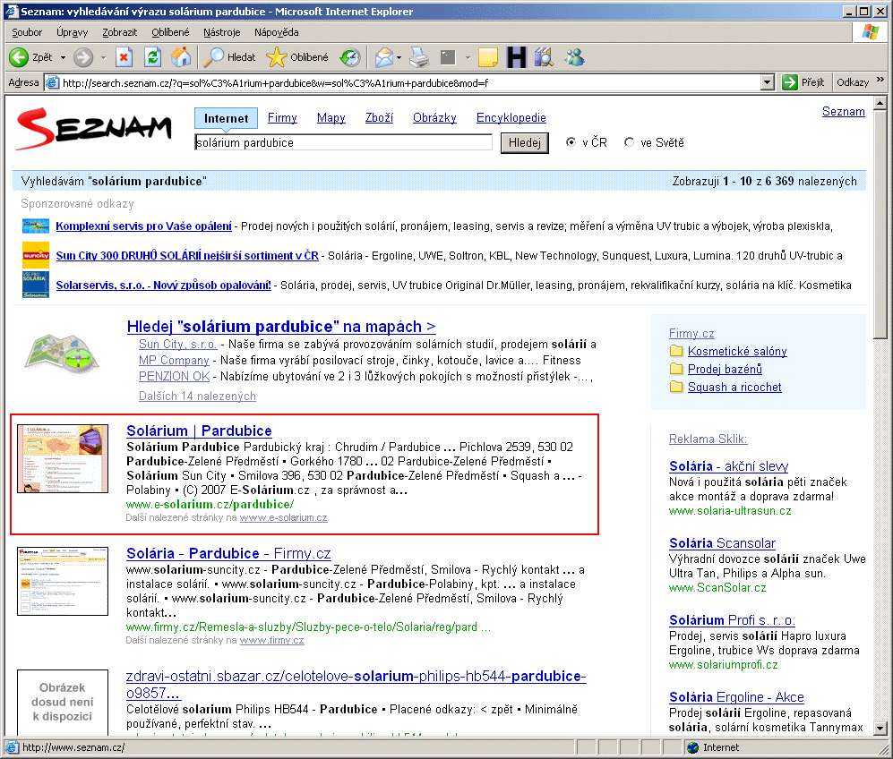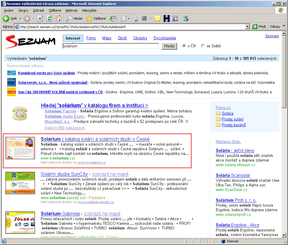 1. místo na Seznamu na dotaz "solárium" - ukázat obrázek z 24. 10. 2007.